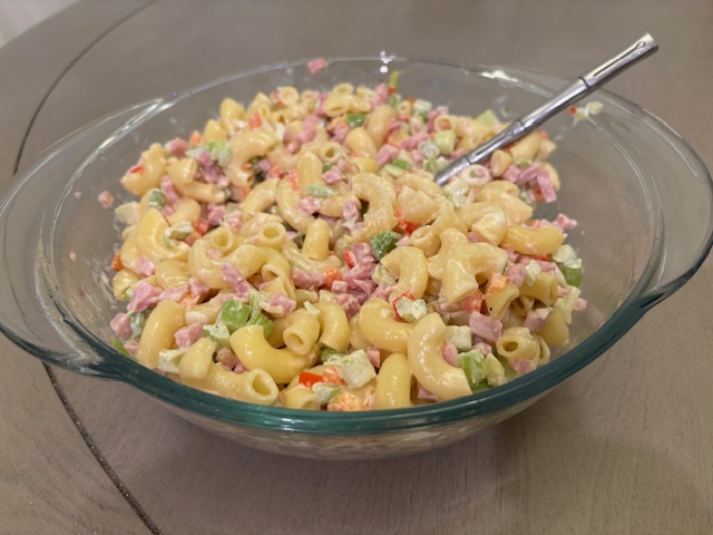 - Add pasta to a large mixing bowl and coat pasta well with mayonnaise